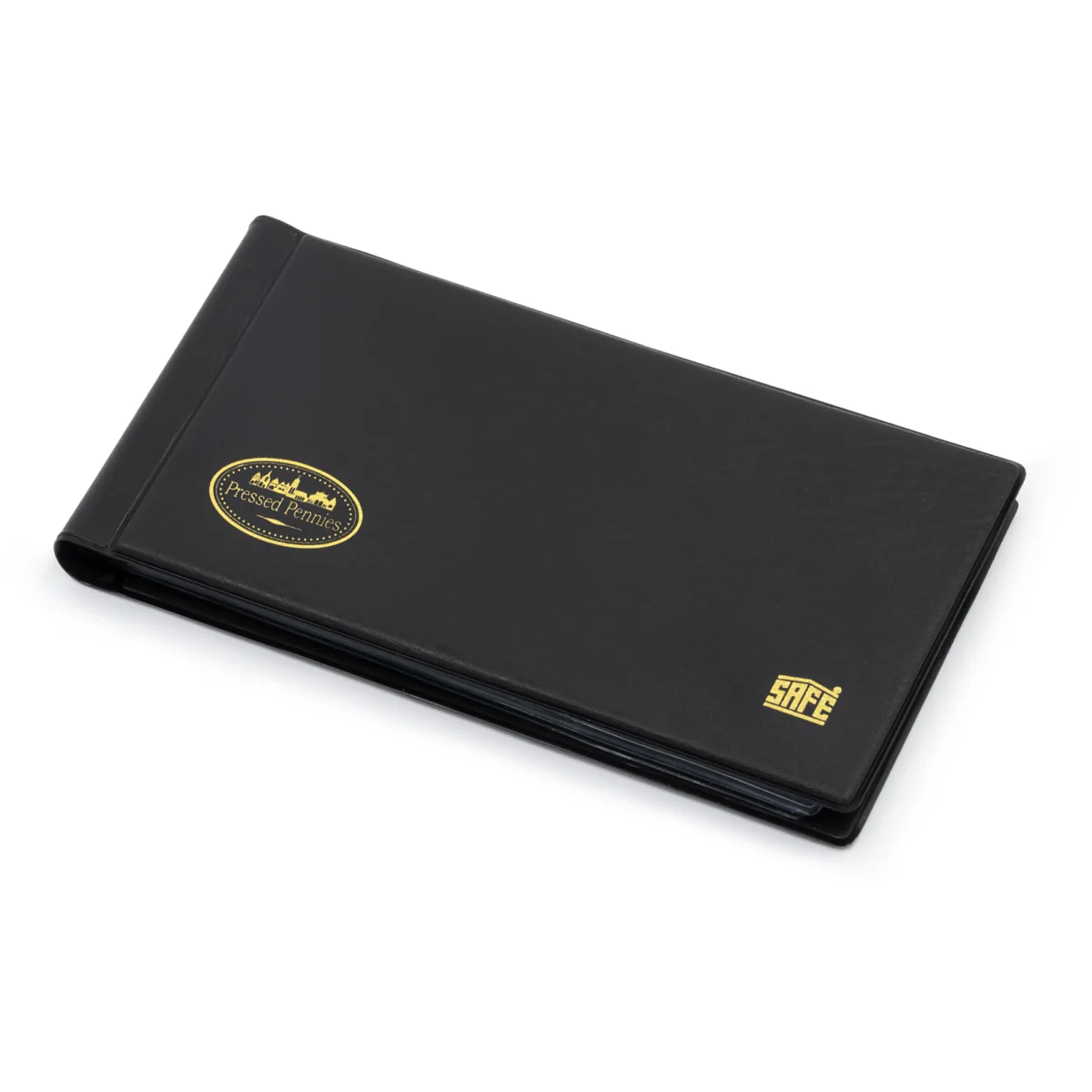 Pressed Penny Album Wallet – Handy, elegant, black padded pocket coin album – Now with 10 crystal clear pages that fit 8 pressed pennies on each page. Beautiful leather-grained wallet without the expense. Made for 80 coins. Great to take to shows!
