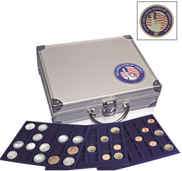Aluminum case with reinforced metal corners and new embossed metal “USA” insignia from SAFE. Front snap latch and key lock which guarantees a solid closure of the case, supplied with two (2) keys. Inside of case is lined with royal blue, archival velvet and includes a tray lifter for easy tray removal. Ergonomic, carrying handle making it perfect to take to coin clubs or shows.