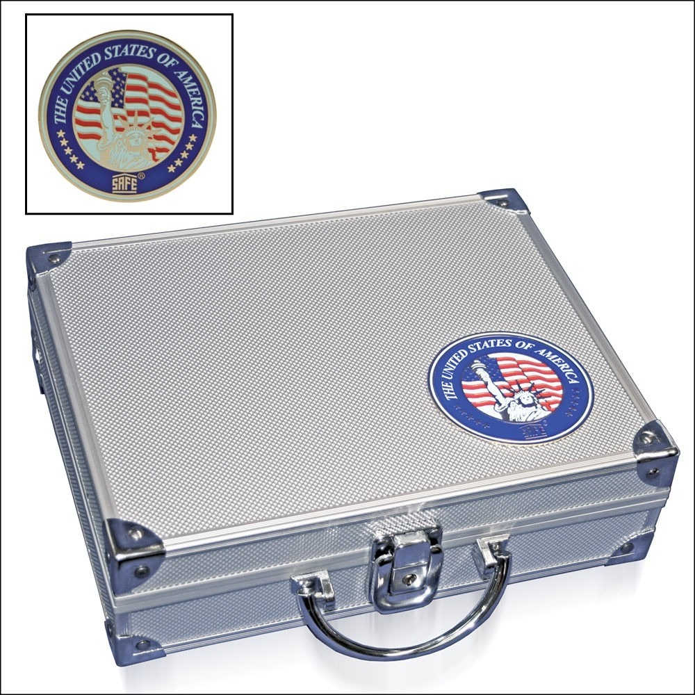 Aluminum case with reinforced metal corners and new embossed metal “USA” insignia from SAFE. Front snap latch and key lock which guarantees a solid closure of the case, supplied with two (2) keys. Inside of case is lined with royal blue, archival velvet and includes a tray lifter for easy tray removal. Ergonomic, carrying handle making it perfect to take to coin clubs or shows.