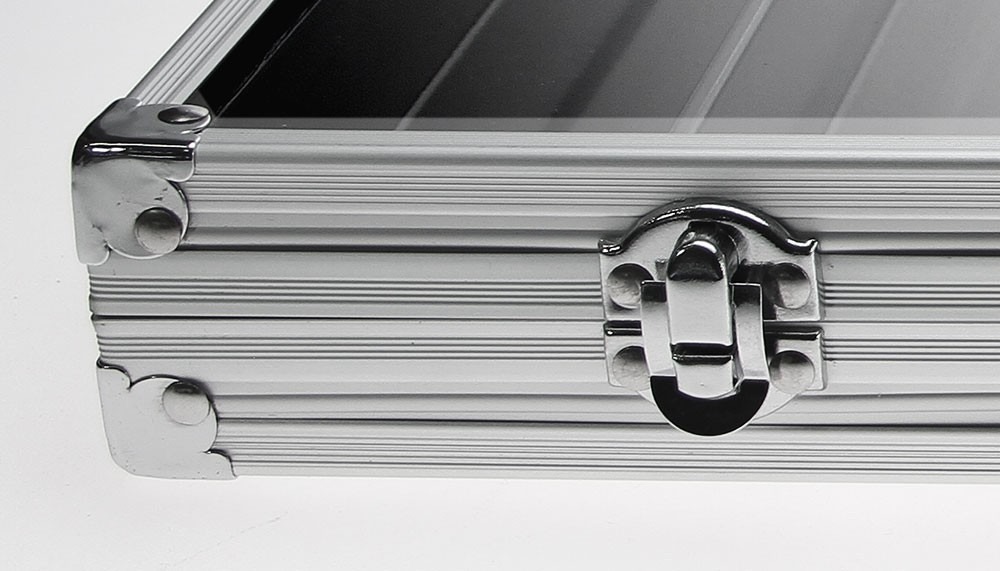 Organize your collection in this sturdy aluminum case. View the objects through the clear, acrylic lid with foam edging for a secure seal. The transparent tray is removable and compartments are available in 4 different sizes for almost anything collectible. The possibilities are endless.