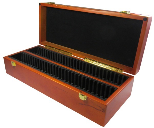 This new universal wood display box is the first of its kind! You won’t find a bigger, better build box anywhere else on the market. Hand-made with real wood, this light cherry/cedar color coin slab box accommodates 30 slabs in two vertical rows. The box comes with two secure latches to keep the lid shut and secure.