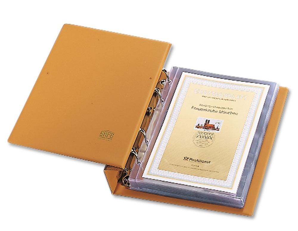 This richly padded, tan simulated leather Luxus album (No. 7870) has a strong 4-ring clamping mechanism located on the inside of the front cover, holding together the cover and the ring mechanism after closing, just like a book. or covers, postcards & currency. Perhaps add a matching, handmade slipcase. Then select your pages to perfectly customize your album! (See more details below the pages.) This album has received the best customer reviews consistently for over 25 years