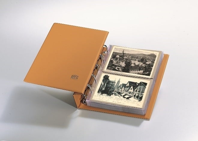 Compact Luxus saddle tan album supplied with 10 pages No. 7869 for Vintage Postcards and tan polyester inserts. 7869 page has 2 pockets (5-5/8″ x 3-3/4″ each). Transparent pages let you see both sides of the item or use tan pocket inserts to place items back to back.