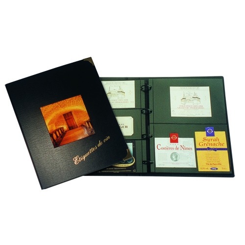 Wine Label Album as pictured, provided with brass corners and a removable cover image. Sturdy 4-ring binder, supplied with eight 2-pocket pages (No. 452) and two 3-pocket pages (No. 453) for more than 70 labels.