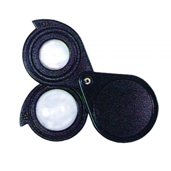 Folding Pocket Magnifier with individual 3/4″ and 9/16″ diameter lenses 8X+10X magnification. Black. lightweight plastic case.