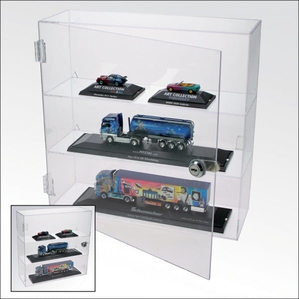 Crystal clear acrylic glass cabinet can stand alone or can be hung on your wall. Holes on back panel are pre-drilled for easy hanging. The cabinet locks with a key to protect your display.
