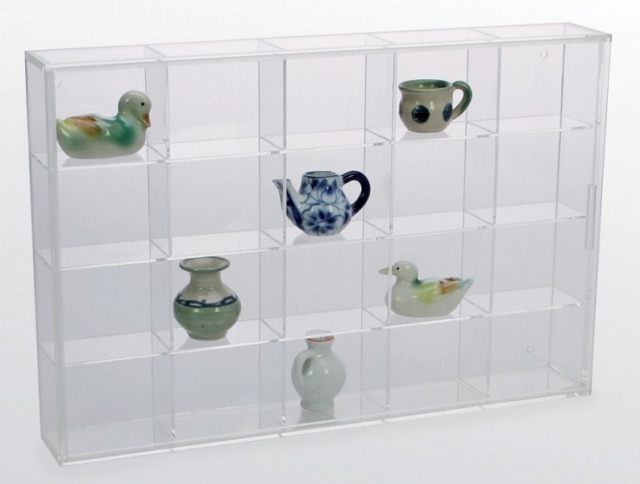 Made of crystal clear acrylic glass, these sleek cabinets are made to hang on your wall and come in 6 different styles/sizes. Since they are frameless and hingeless, the focus is on your miniature figurine collection, not the hardware. The clear front panel slides into place. Hang over a mirror and add top UV lighting for a dramatic effect to complement any decor.