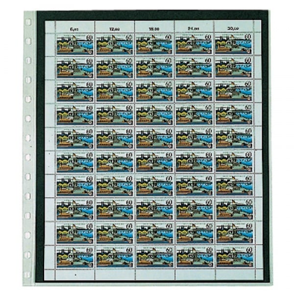 These 14-hole polyester pages are especially useful for large stationery, mint sheets, etc. Crystal clear pocket on one side, pages are supplied with pH-neutral black cardboard inserts for use as double-sided pages for efficient storage. Fit all Classic 14-ring albums.