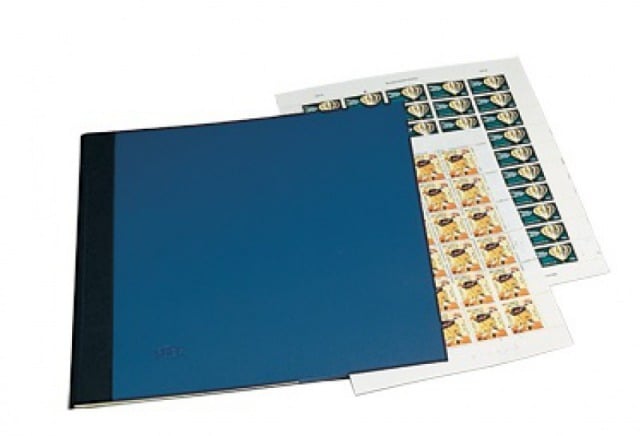 Glassine Envelopes Portfolio for Mint Sheets – Just like glassine envelopes, you can see your stamps while storing them. The glassine pages keep stamps from curling. Each portfolio has sixteen (16) glassine pocket pages bound into a heavy plastic blue cover. If something spills on the cover, it easily wipes clean. Sturdy construction.