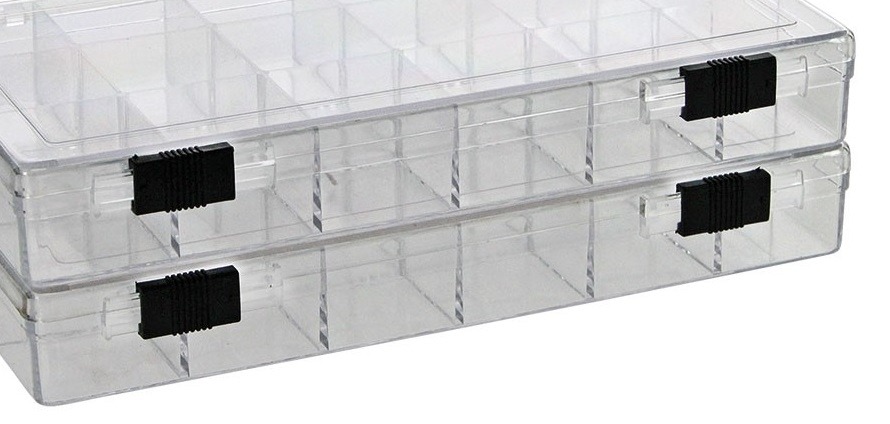 Rock Collection Box-Acrylic glass, travel sized, transparent box with 36 individual compartments and two sliding latches.