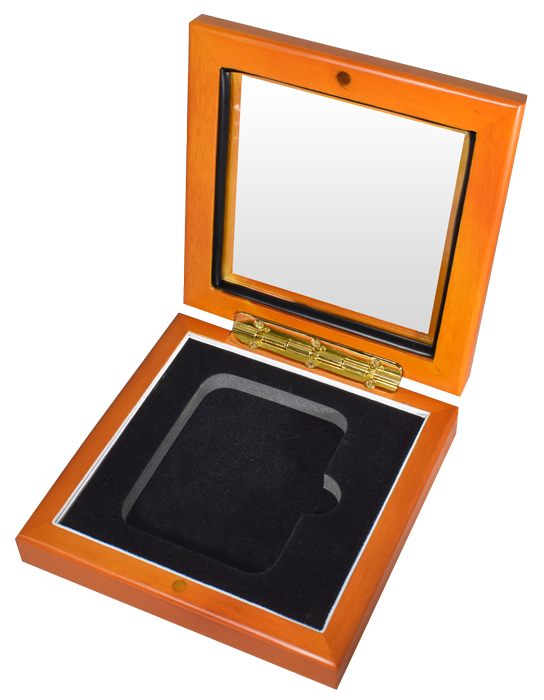 Holds one slab from most grading services in a beautiful glass top box. Cherrywood finish.