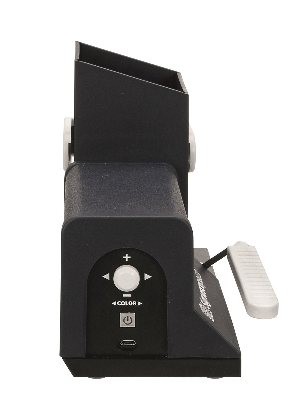 – Multiple colors and 3 different daylight/white lights allow you to fully examine for watermarks, repairs, forgeries, thins, punctures and paper imperfections. The colors can improve the results; for example, a red stamp is irradiated with red light and the red printing ink, which shines through the back of the stamp, is “neutralized”. The watermark or repair is not disturbed by undesired color influences and stands out more clearly. The stepless contrast adjustment enables optimal illumination of the stamp (maximum light intensity does not necessarily bring the best result).